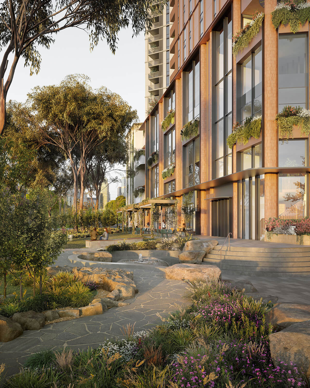 As though nature has taken over, the native forest rises from the ground level and up through the central spine of the building to the landscaped podium level. From here, balconies with lush green bowl gardens are positioned to continue this green spine up the building to the exclusive rooftop deck, ensuring the connection between park and building is continued right to its very peak